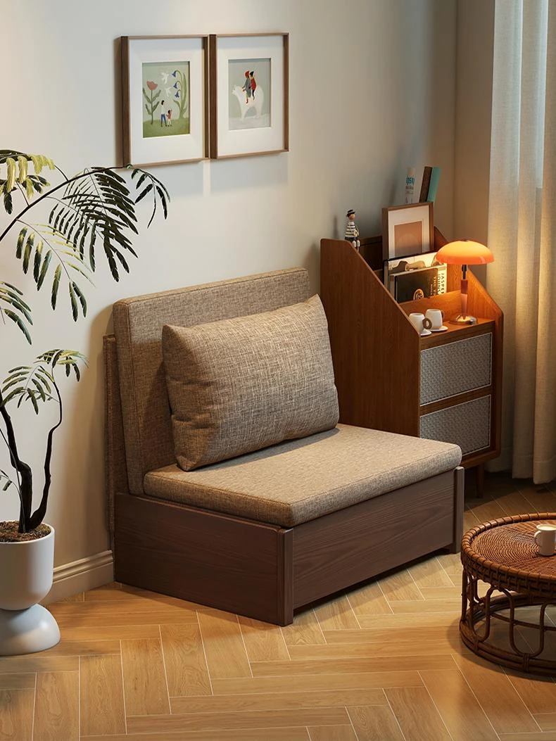 中古風デザインの一人用ソファベッド、折りたたみ式・多機能、陽台にもぴったり!高品質な無垢材使用、小スペース向けのスリムな伸縮ベッドで、おしゃれで実用的なライフスタイルを実現!