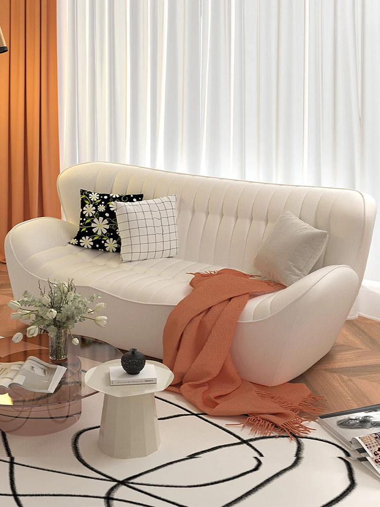 イタリアンミニマルキャットグラブ皮革ソファ - モダンでシンプル、小型リビングに最適な北欧スタイルの軽やかなクリーム色セーリングソファ。優雅さと快適さを兼ね備えたデザインで、愛猫と一緒にくつろぎのひとときをお楽しみください。